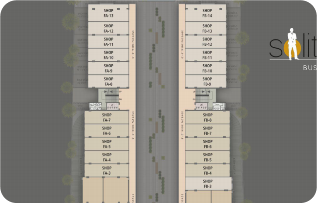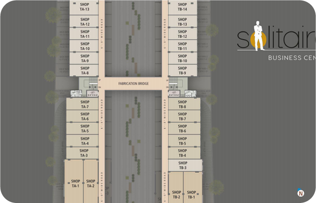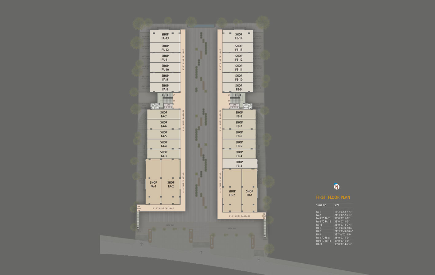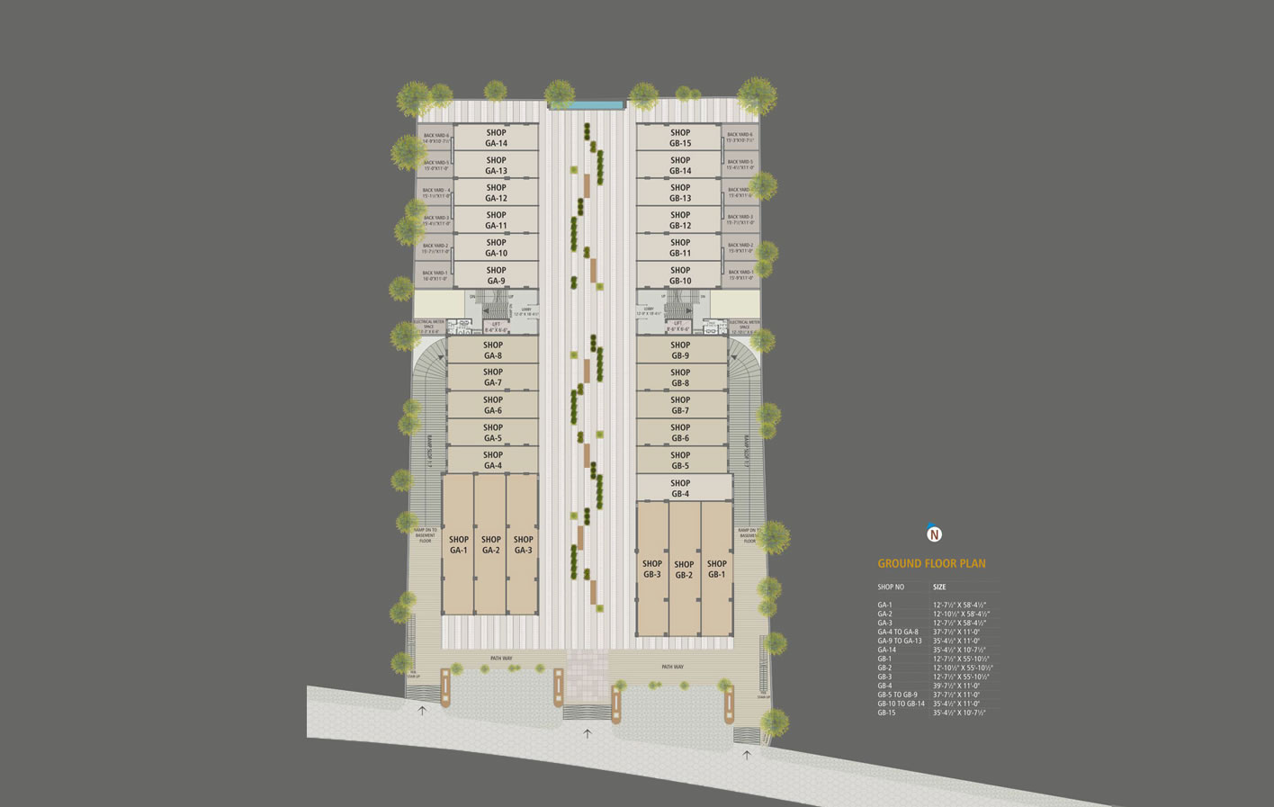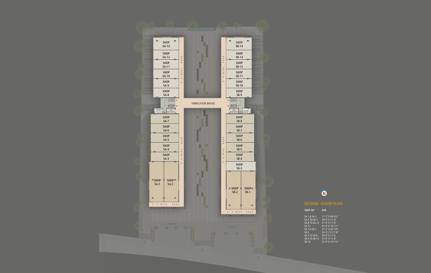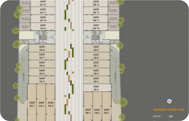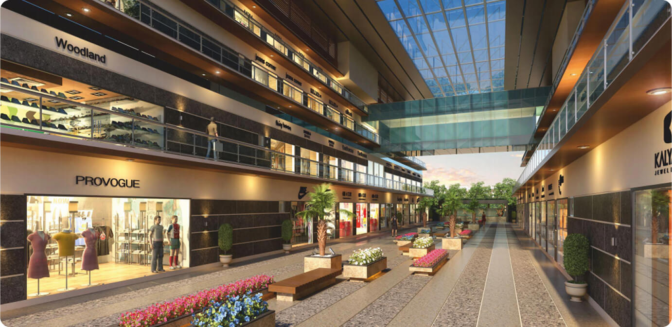 Internal white putty on walls. Granamite tiles of 2’-0” in shops and offices. Manual operated rolling shutter made of G.I.